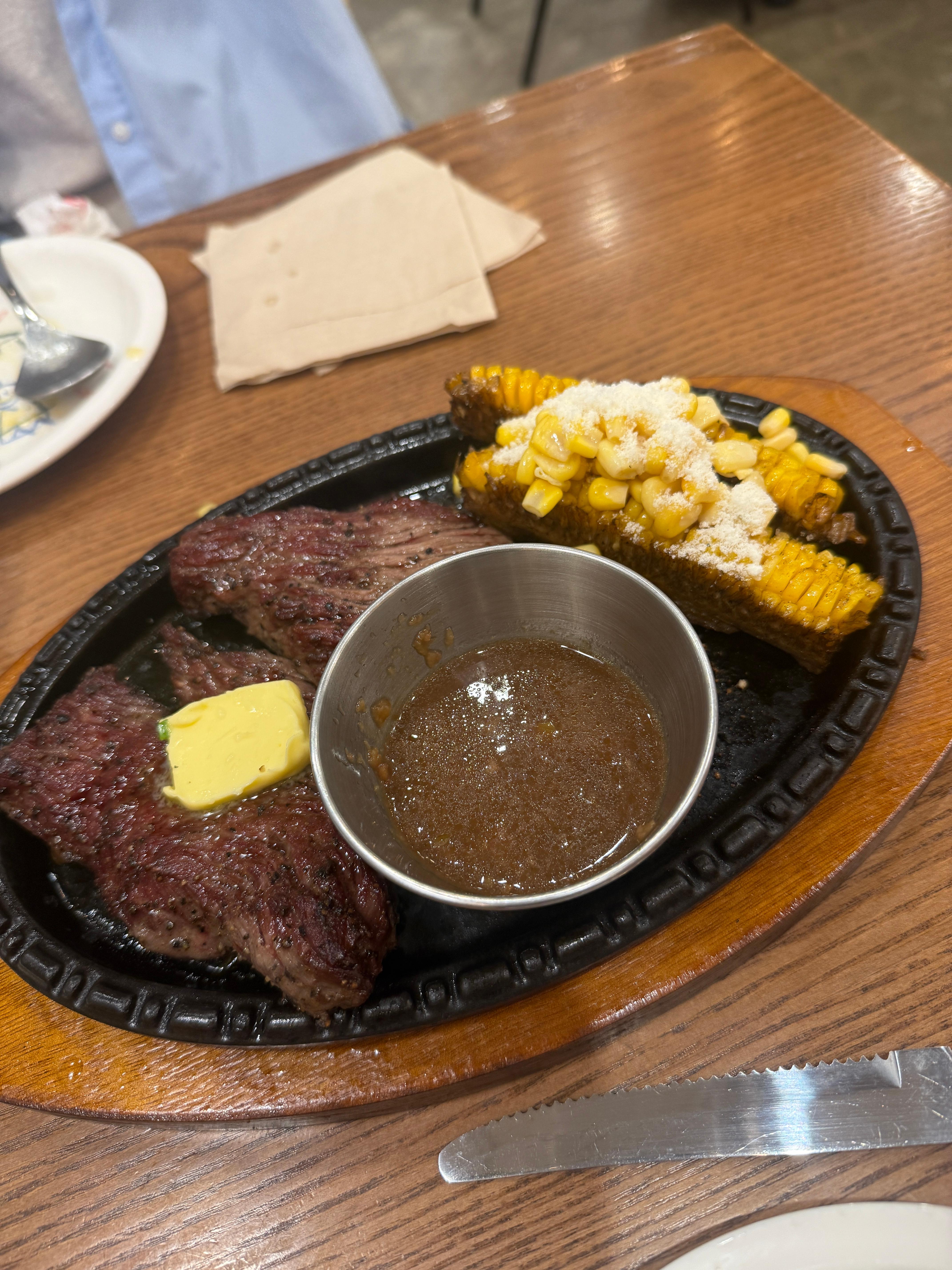 육즙 가득한 갈비살에 옥수수와 갈릭소스가 곁들여 나왔어요.